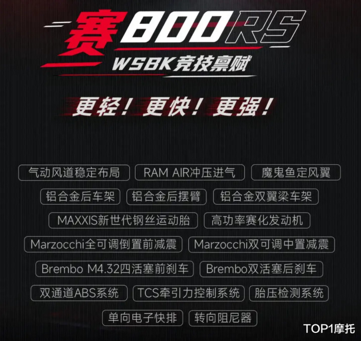 除了狂暴的动力之外,赛800RS还有碾压同级别的高规格名牌配置,包括:车头RAM AIR冲压进气,铝合金后车架、后摇臂、双翼梁车架,全可调的马祖奇前后减震,Brembo的前后刹车卡钳,玛吉斯的高性能运动胎,双通道ABS、TCS,单向电子快排,转向阻尼器,TFT智能仪表,胎压监测等等。这一身配置不仅在国内市场横扫同级,甚至在国际市场上都能够与进口车型分庭抗礼。