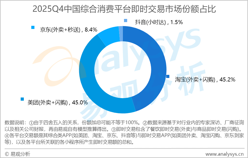 近日,第三方研究机构易观分析发布《2025年第四季度中国即时零售市场报告》,数据显示,2025年第四季度,淘宝闪购在即时零售市场的成交份额达到45.2%,美团以45%的份额紧随其后,两者差距仅0.2个百分点,基本持平。